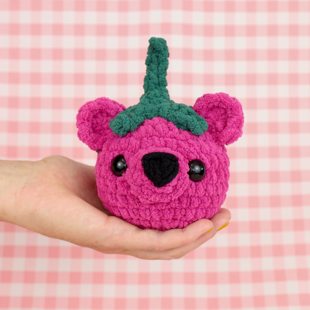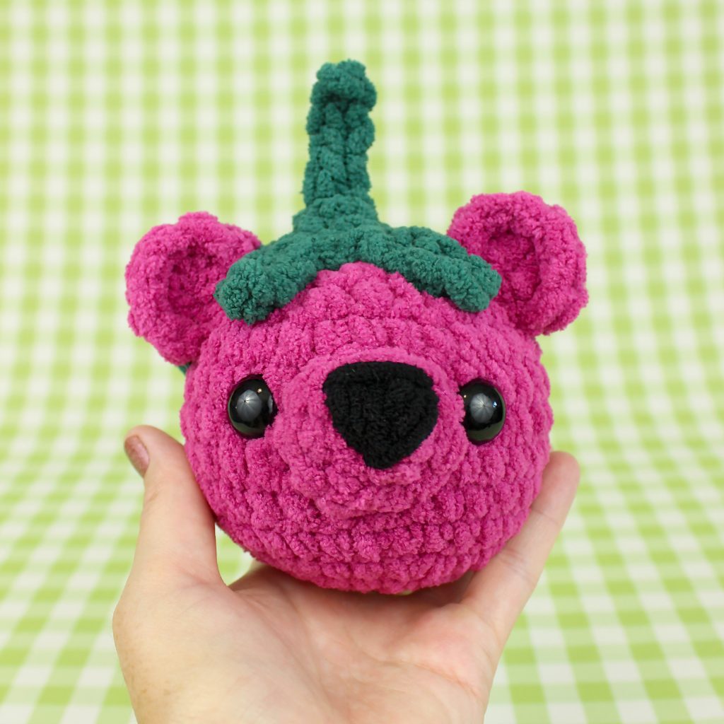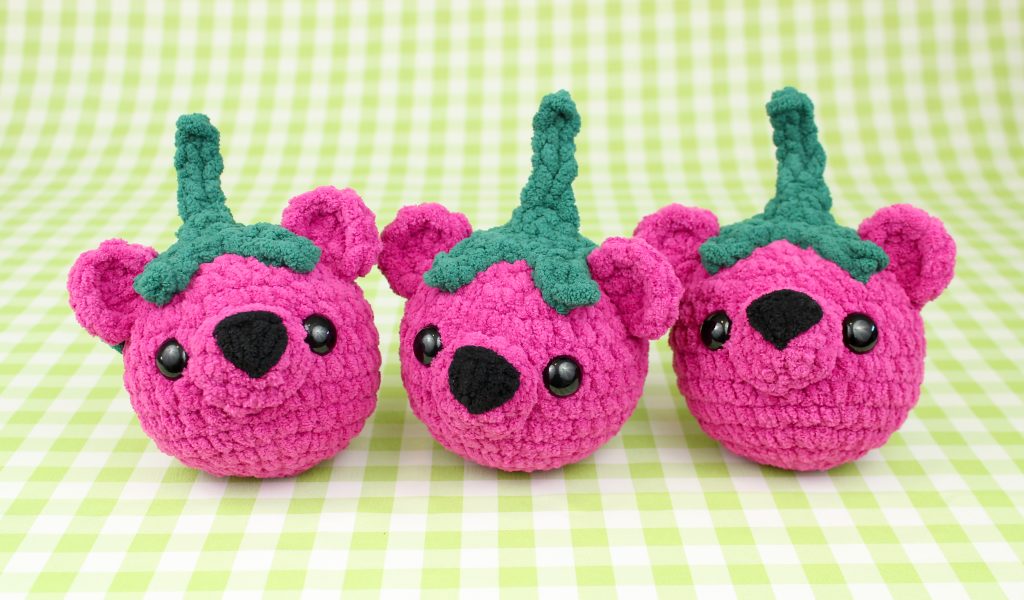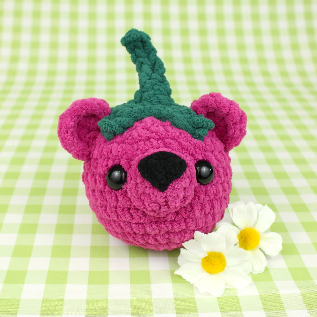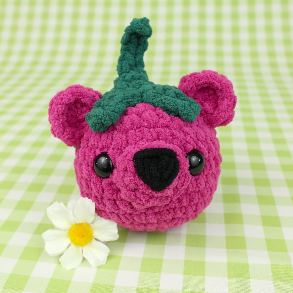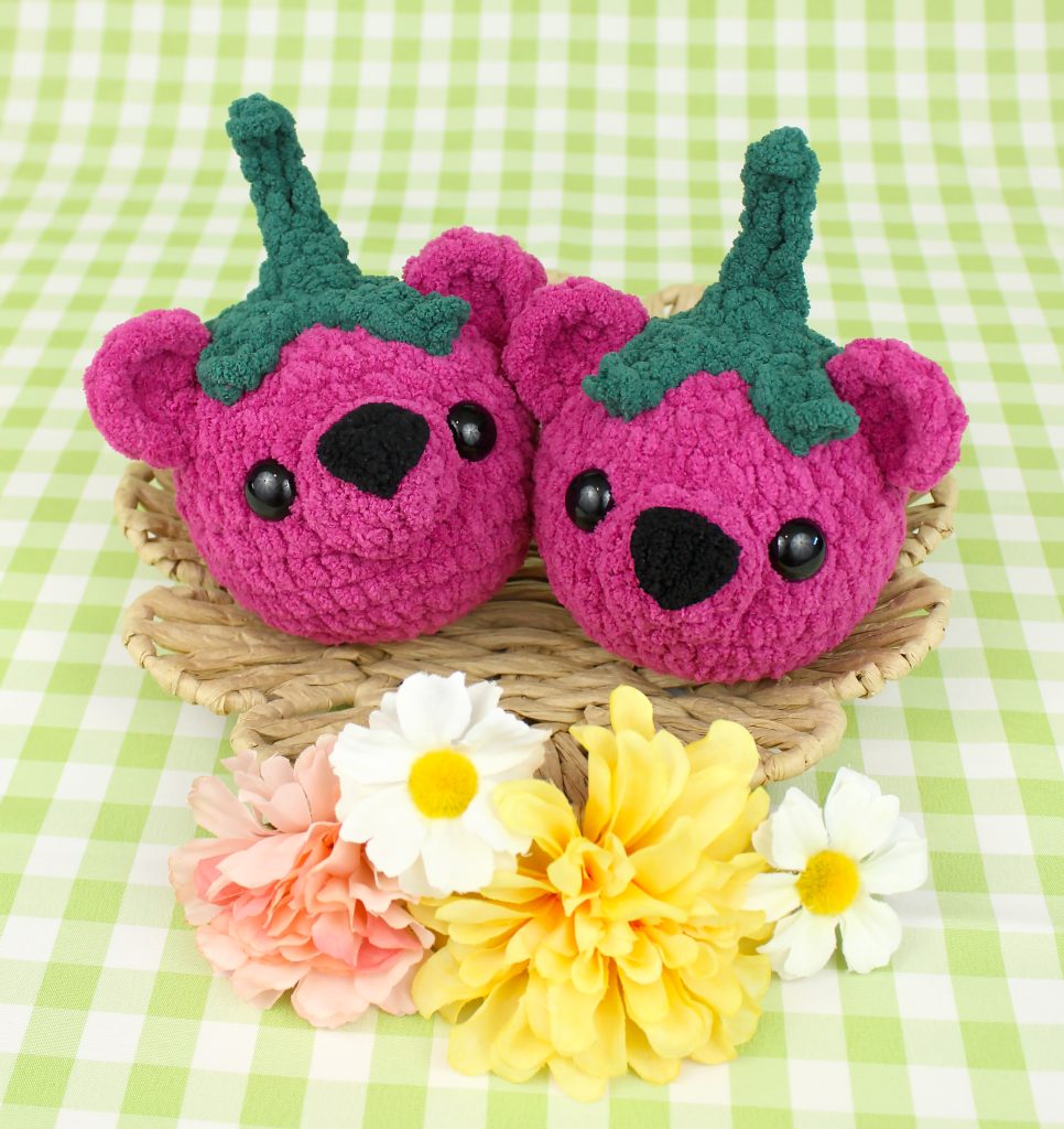 In a quiet corner of a cozy garden, nestled between strawberry patches and raspberry bushes, live a whimsical bunch of pink crochet bears known as Bearies. With soft yarn for fur and a sweet berry scent, these little berry bears are stitched together with handmade love. Their gentle eyes twinkle with glee, and tiny green leaves sprout from the top of their heads like a crown. These curious creatures spend their days napping in sunbeams and collecting wildflowers. Half fruit, half friend, and entirely magical – it is said to be good luck to find one hiding in a basket of freshly picked berries!
