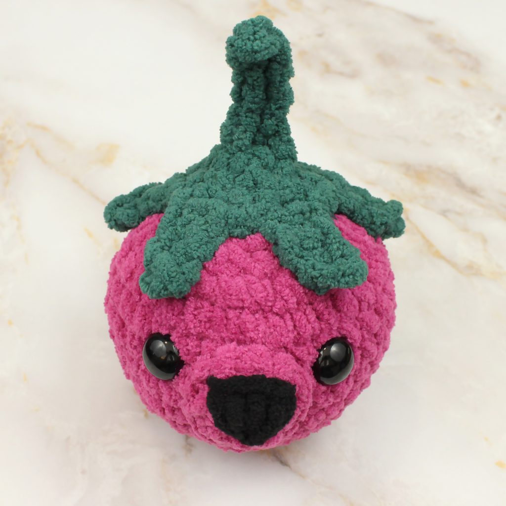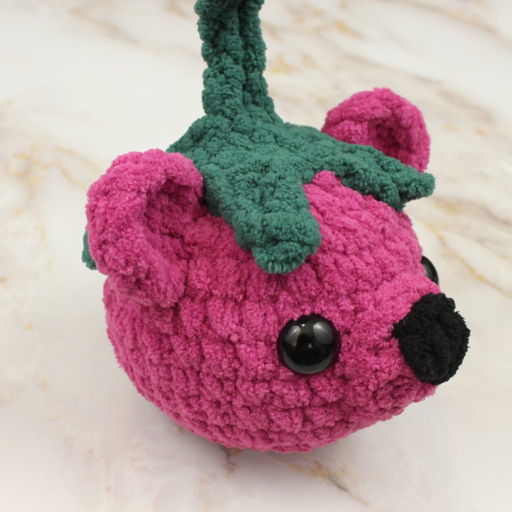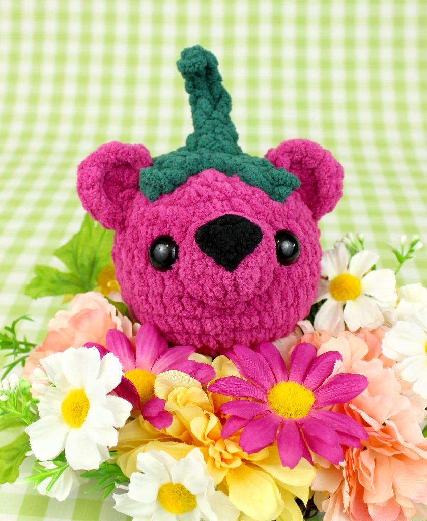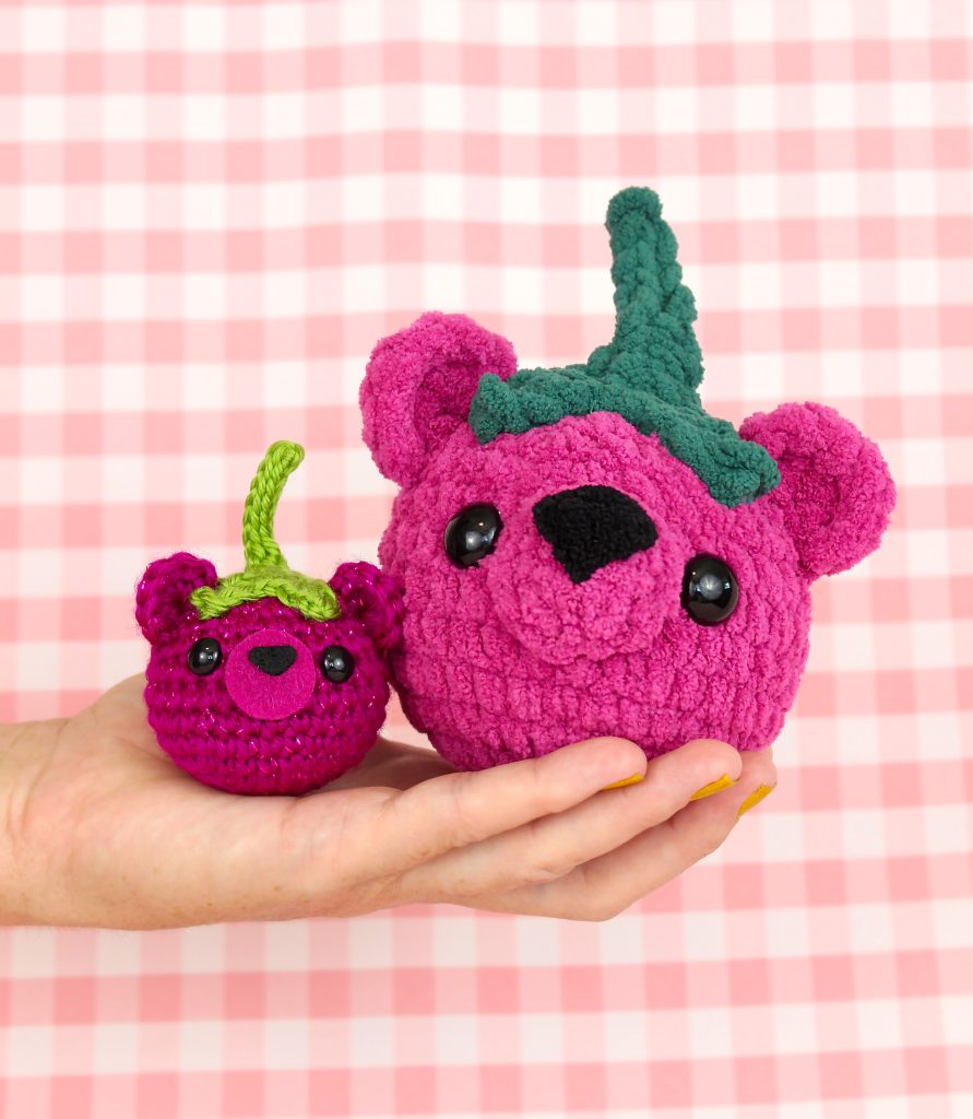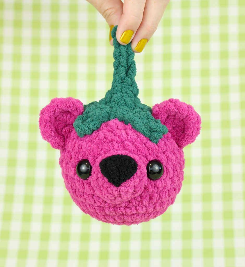 In a quiet corner of a cozy garden, nestled between strawberry patches and raspberry bushes, live a whimsical bunch of pink crochet bears known as Bearies. With soft yarn for fur and a sweet berry scent, these little berry bears are stitched together with handmade love. Their gentle eyes twinkle with glee, and tiny green leaves sprout from the top of their heads like a crown. These curious creatures spend their days napping in sunbeams and collecting wildflowers. Half fruit, half friend, and entirely magical – it is said to be good luck to find one hiding in a basket of freshly picked berries!
